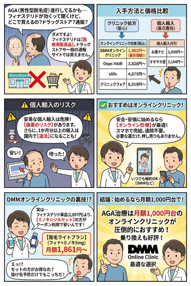 「もっと安く手に入れたい」と考えて、海外通販サイトや個人輸入代行を利用するのはおすすめできません。確かにインド製ジェネリック(フィンペシアなど)は日本より安く見える場合がありますが、近年では国内オンライン診療でも 月額1,000円台のプラン(DMMオンラインクリニックなど) が登場しており、価格差はほとんどなくなっています。