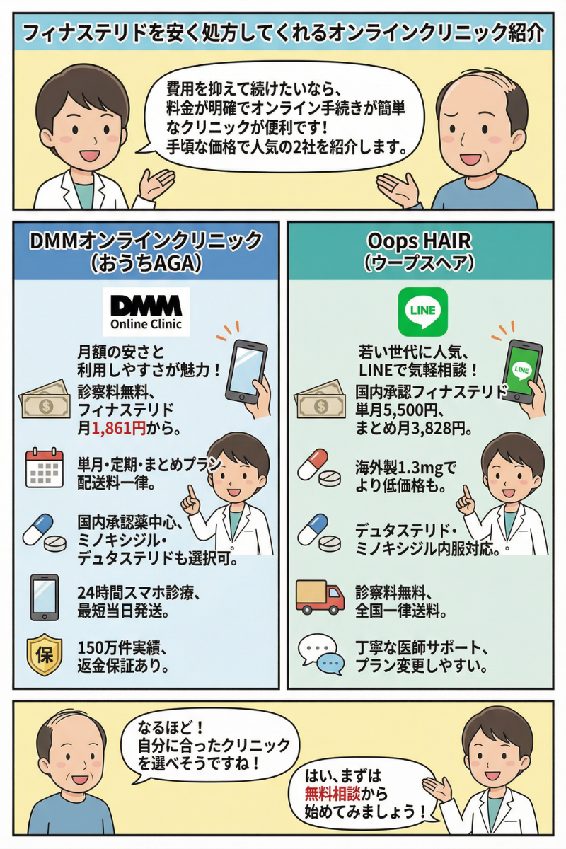 ここからは、フィナステリドをお得に処方してくれるオンラインクリニックをご紹介します。各クリニックの料金プラン(初回・定期・診察料)、処方される薬の種類、診療の流れや配送・サポート体制などを比較しながら、自分に合ったところを探してみてください。