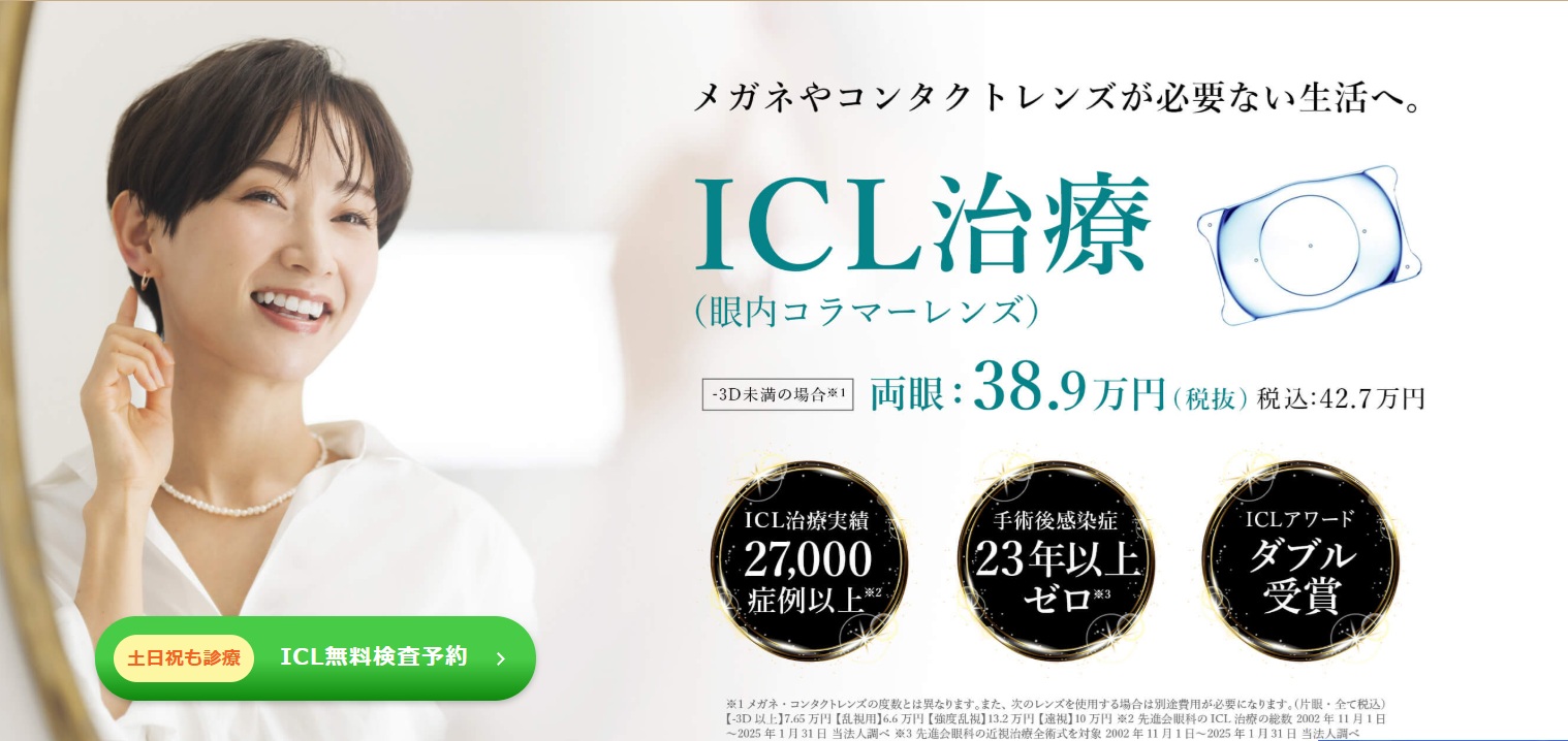 | まとめ | 費用は相場より高めですが、技術力の高さと3年間の手厚い保証が魅力です。安心感重視でICLを選びたい方に向いたクリニックです。 |